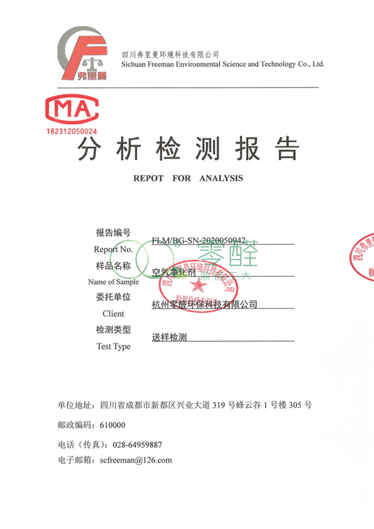 检测报告:甲醛去除率