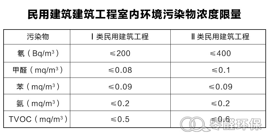 GB50325标准由国家质量监督检验检疫总局和建设部于2001年联合发布,2002年正式实施,并在2006、2010、2013年做了相关修改。它属于建筑工程环境污染物控制规范,只涉及5项空气指标,分别是甲醛、苯系物、氨、氡和TVOC,检测条件是关闭门窗1小时。其执行对象分为两类:Ⅰ类民用工程建筑和Ⅱ类民用建筑工程,具体标准见下图:
