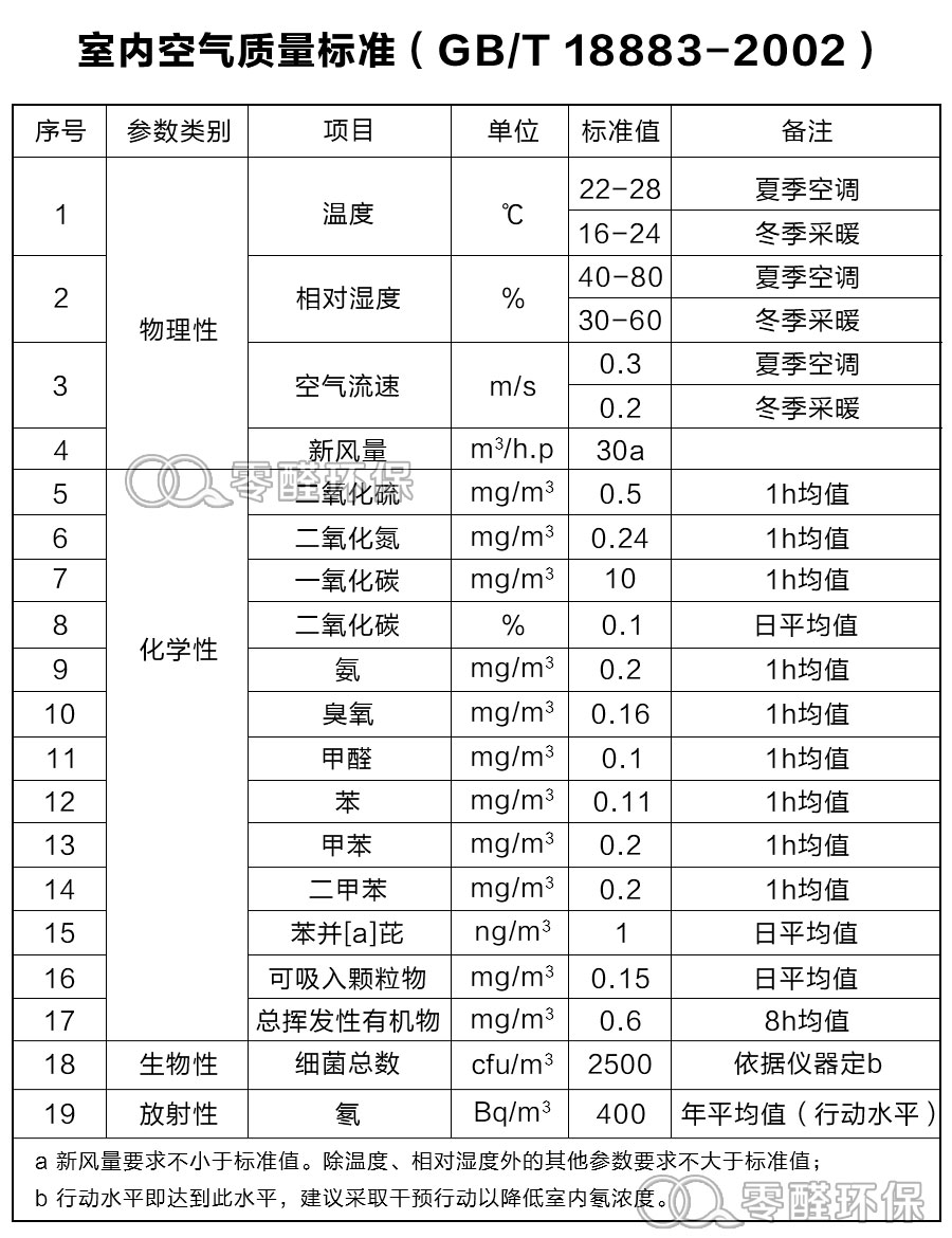 GB/T18883是2012年国家环保总局和卫生部发布的国家推荐性标准,非强制性执行。其属于人居环境健康的最低标准,涉及到19项空气质量指标,其中对于甲醛、TVOC和苯等严重危害人体健康的有害物质做了详细规定。其检测条件是关闭门窗12小时。这也是我们零醛环保常规检测时所采用的标准。